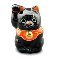 九谷焼金(素地:石川県産、加飾:九谷焼産地) 素材:磁器 :幅4.5cm×奥行4.5cm X 高さ7cm 一点一点手描きで、表情豊かな九谷焼の招き猫。 ちょこんと手のひらに乗るで、机や本棚に置くと、目が合うたびになんとも微笑ましい気持ちになります。 右手をあげているのはお金、左手をあげているのは人や縁を招いてくれます。 黒い招き猫には、厄除けの意味があるといわれています。