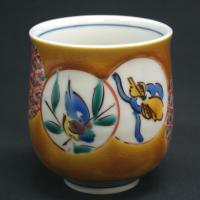 ■九谷焼の画風紹介: 吉田屋(Yoshidaya) 豊田伝右門(約180年前) 古九谷の再興目的の吉田屋窯は、青手古九谷の塗埋様式を取り入れ、赤を使わず、青(緑)、黄、紫、紺の四彩を用い模様の他に小紋を地紋様にして、器全面を絵具で塗り埋めた重厚な作風であり、独特の雰囲気をかもし出しています。 ■日本製:九谷焼(陶磁器) ■:径7.5cm×高さ8.8cm ■紙箱入り ■送料840円(沖縄2100円) ■包装、おのし、ーー無料! ■おすすめ 母の日/蔑日/敬老の日/お中元/記念品/お祝い//還暦祝い/古希祝い/喜寿祝い/傘寿祝い/米寿祝い/贈り物/結婚内祝い/新築内祝い/出産内祝い/お返し/内祝い/開店祝い/開業祝い//誕生日/両親/男性/友達/海外/外国/日本らしいお土産
