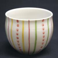 寸法:口径7cm×高さ6.8cm 初代東文吉(1854〜1913)は、陶祖斉田道開の弟子として陶技を習得。 その後多くの弟子を育成し九谷焼の発展に生涯を捧げた。 現在の文吉窯は、初代の頃の豪華絢爛な意匠とはかなり趣を異にするが、焼物に対するしたたかなこだわりをあくまでも継承し、1品1品手造り手描きの心のこもった「うつわ」造りに日々専心している。