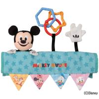 ベビーカーのセーフティーバーに取り付けるカバータイプのおもちゃです。 笛入りぬいぐるみ、カチカチリング、パリパリ入りマスコットの3つの遊びが楽しめます。