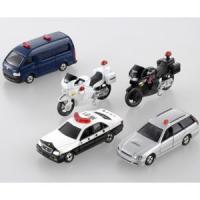 遊撃車(トヨタ ハイエース)、白バイ(Honda VFR)、黒バイ(Honda VFR)、パトカー(トヨタ クラウン)、捜査用車(スバル レガシィ ツーリングワゴン)の緊急車両5種のセットだよ。