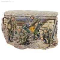 ドラゴン DR6155 ミリタリー ノルマンディ地方の生け垣を利用して攻撃を繰り広げる緊張感あふれるポーズでモデル化しています。 服装は戦闘服の上に迷彩コート、ヤッケを着用したスタイルで、コートの裾や袖口の立体的な表現や胸元の紐、さらに、ベルトやサスペンダーなども細かく再現。 自然な皺やたるみ、さらに、水筒やスコップをはじめとする個人装備品も加わって実感あふれる仕上がりです。 ヘルメットはカモフラージュカバーを被せた状態のものもセット。 ノーマルタイプのヘルメットと質感の違いも情景に表情をげようとするポーズ。 1体は両膝をついて射撃するポーズ。 そして残りの2体は体を少し低くして様子を探る姿勢。 4体のみで生垣などのベースを作れば、緊迫したビネットが製作可能。