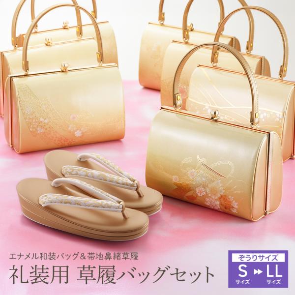 礼装用 草履バッグセット エナメル和装バッグ 帯地ソフト鼻緒草履セット ゴールド S~LLサイズ 全10柄 bs-375