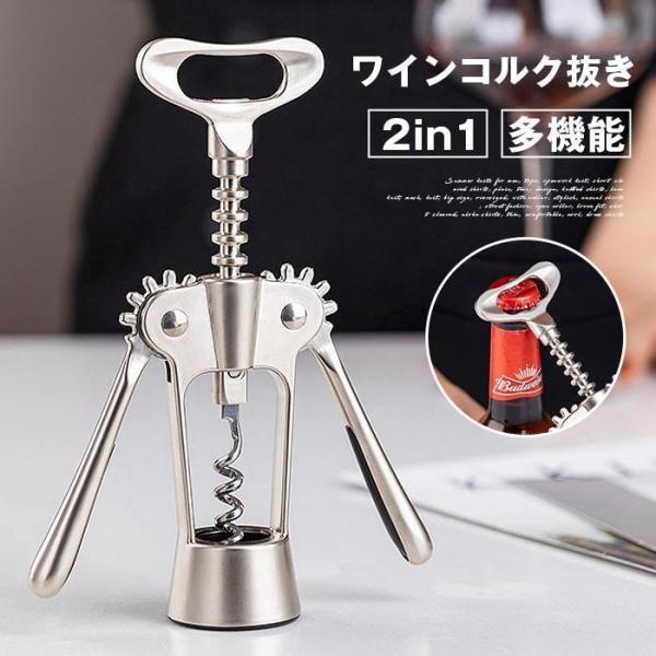 ワインコルク抜き ワインオープナー ビール ステンレス 簡単 栓 栓抜きオープナー ワイングッズ ボトルオープナー 2in1 多